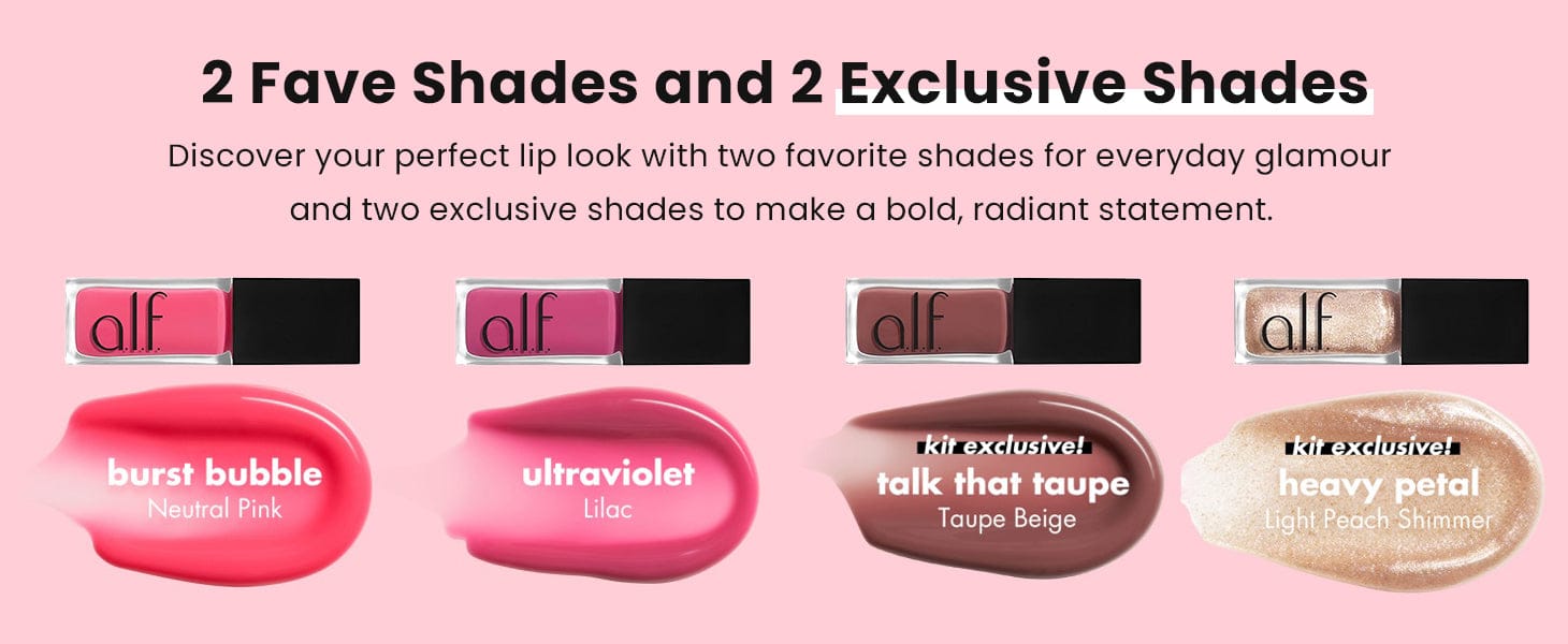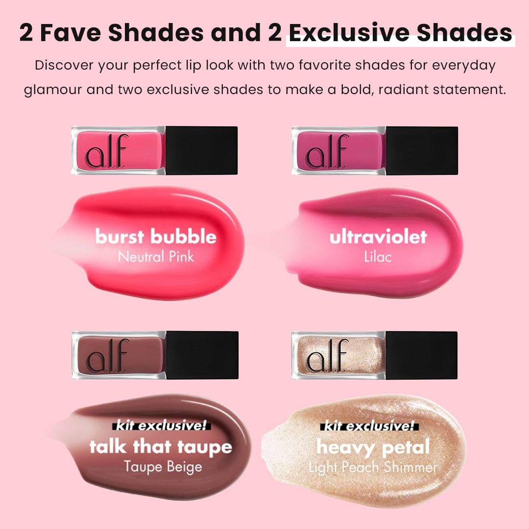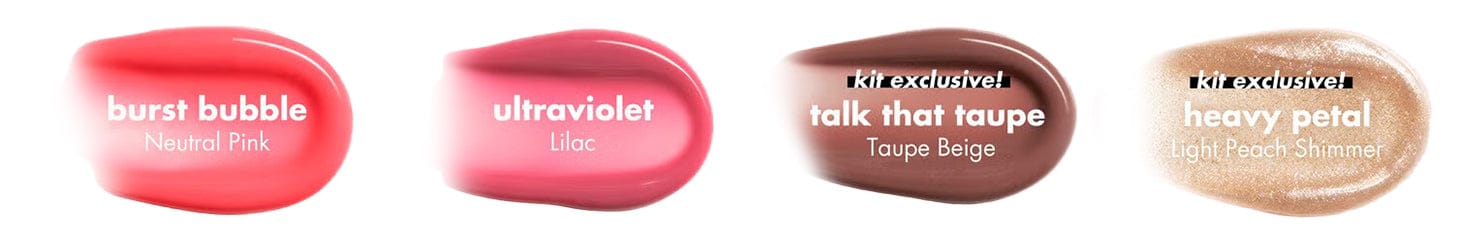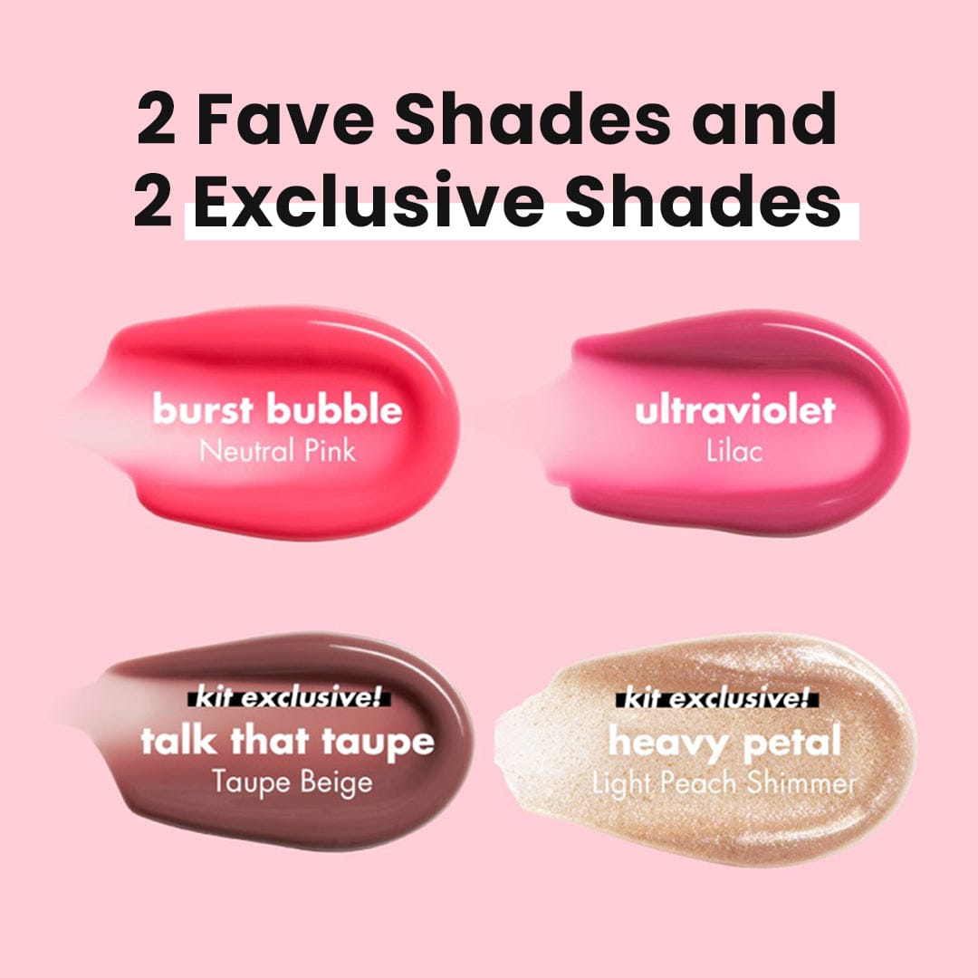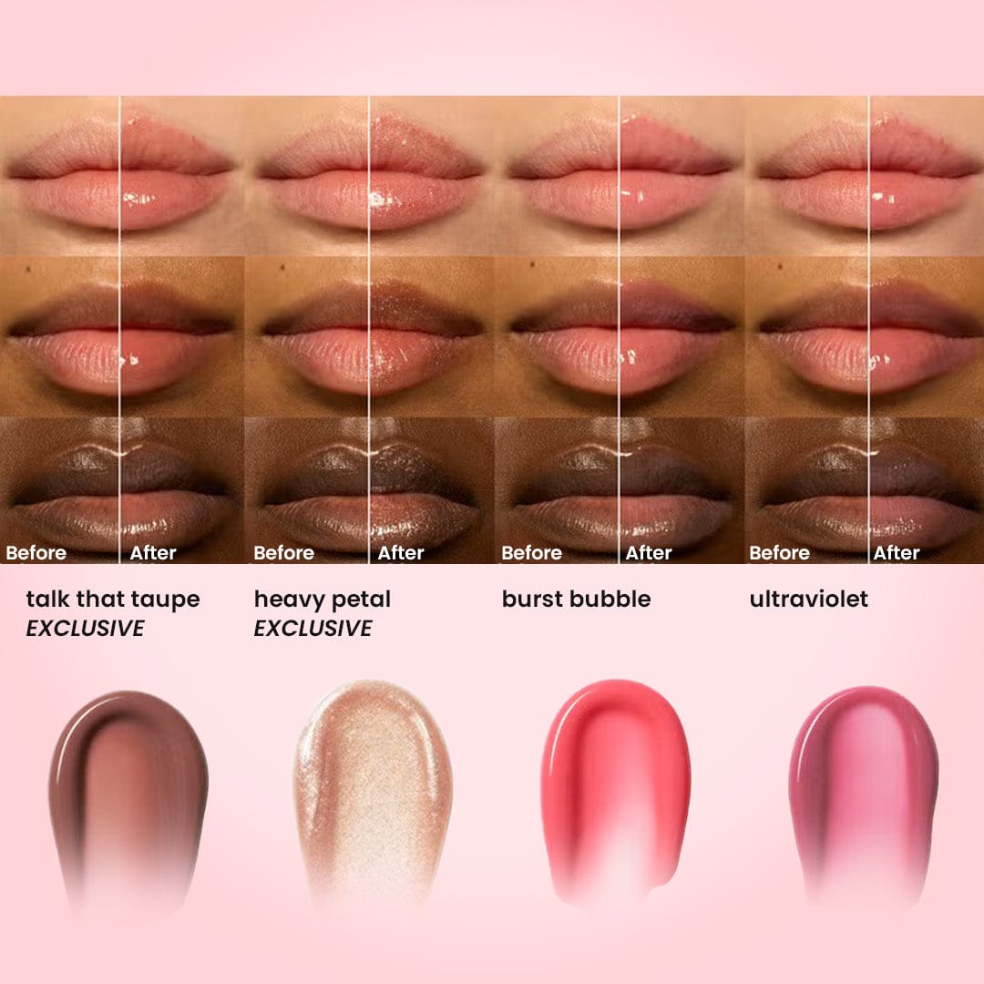 Get 4 Plumping Lip Oils in one must-have lip kit, featuring 2 exclusive shades you won’t find anywhere else! These pout-plumping, tingling lip oils drench lips in a sheer wash of color, with both glossy and glimmer finishes for a juicy lip look.