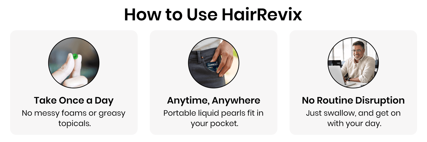 HairRevix works by addressing all the major triggers of male hair loss at once — excessive DHT, high cortisol from stress, and poor follicle nutrition.
