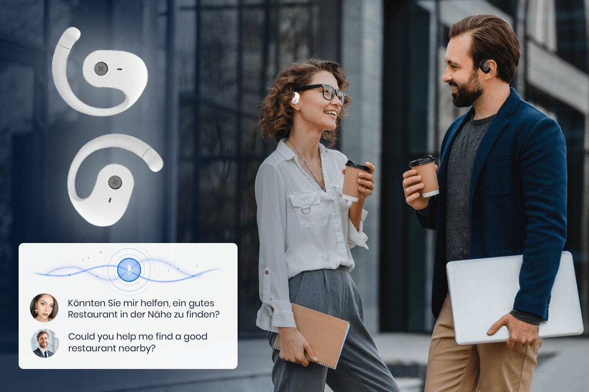 Real-Time Translation for Two People: When both wear the earphones, the system automatically detects and translates both languages in real time. The translated speech plays through the earphones, and bilingual subtitles appear on the connected phone.