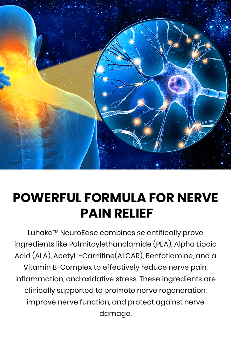 Luhaka™ NeuroEase contains a blend of powerful, research-backed ingredients like Palmitoylethanolamide (PEA), Alpha Lipoic Acid (ALA), Acetyl L-Carnitine (ALCAR), and a unique herbal blend. These ingredients work synergistically to reduce inflammation, support nerve regeneration, and improve nerve function, offering relief from pain, tingling, numbness, and other nerve-related symptoms.