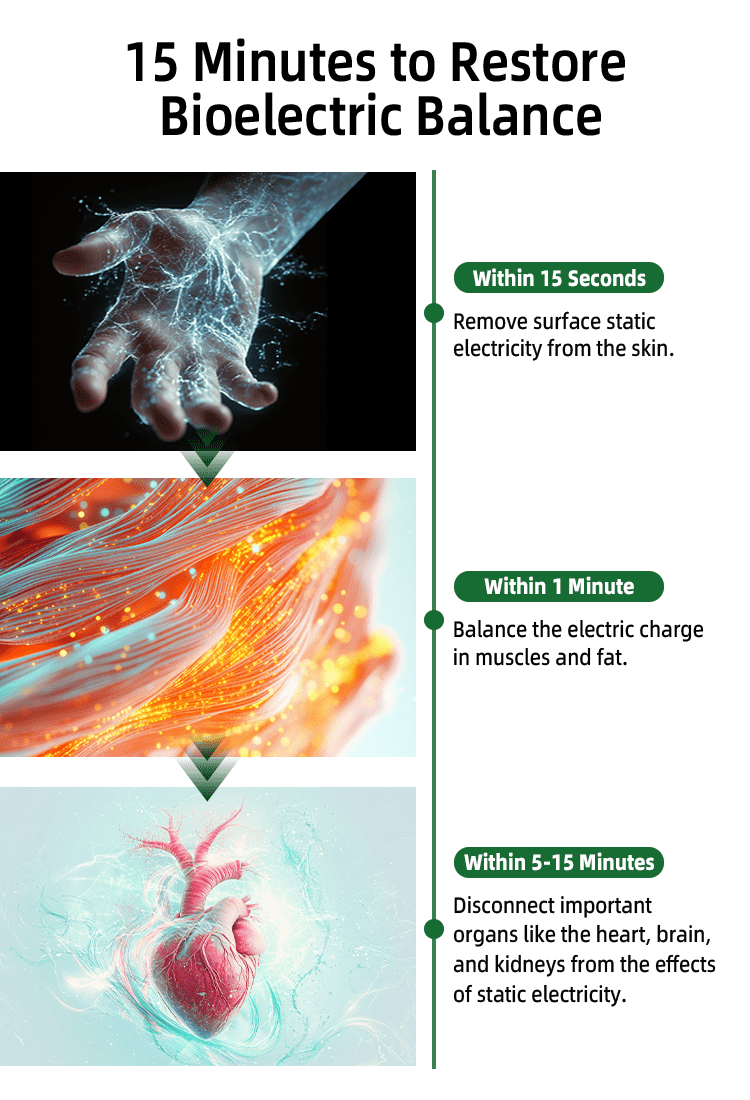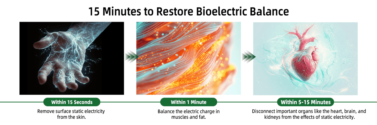 DAFEILA™ NovaGround follows a scientific process to help restore the body’s bioelectrical balance. First, it removes the static electricity accumulated on the skin's surface by direct contact with the Earth, reducing external electromagnetic interference. Next, it balances the electrical charges in muscle and fat tissues, optimizing cellular electrical activity and promoting metabolism and energy flow. Finally, it eliminates the impact of static electricity on vital organs such as the heart, brain, and kidneys, restoring their bioelectrical function, improving circulation, nerve conduction, and endocrine regulation, thereby enhancing overall health and vitality.