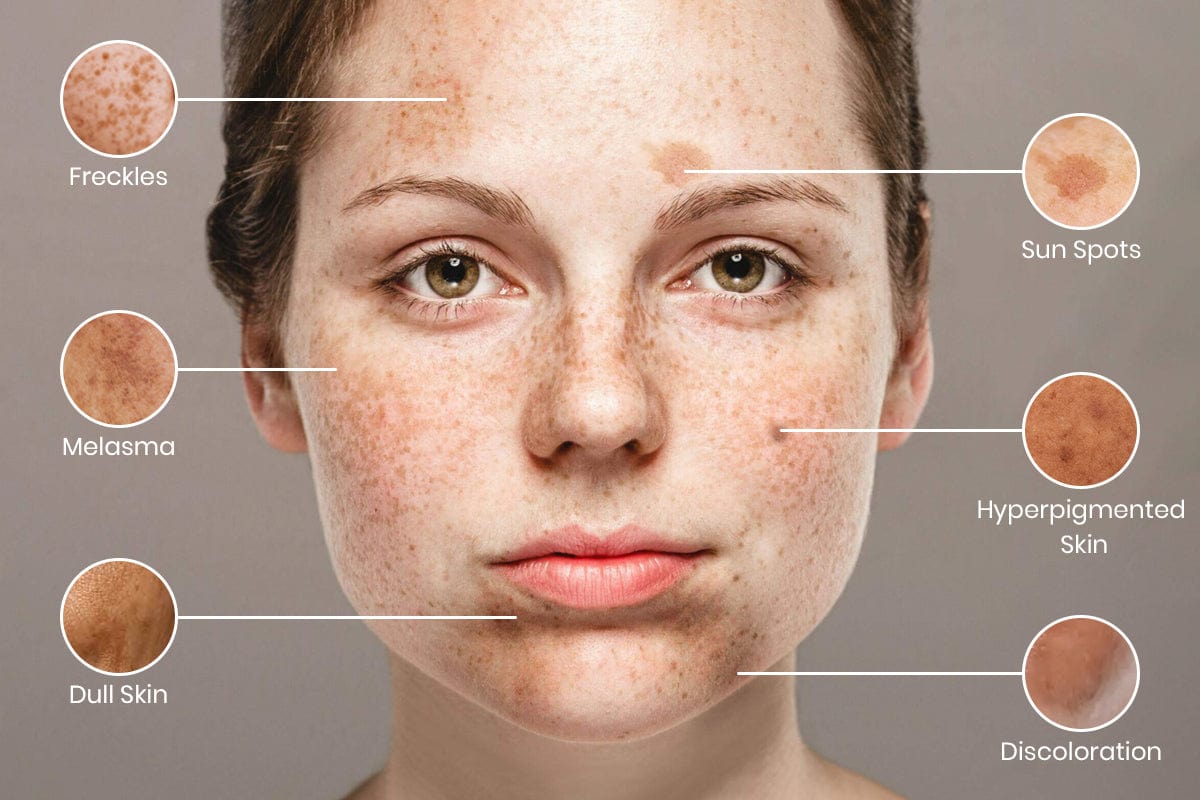 Dark spots and pigmentation occur due to the skin's response to various factors that stimulate melanin production. Melanin is produced as a protective response to ultraviolet (UV) radiation, which helps shield the skin from sun damage. However, prolonged sun exposure, hormonal changes, inflammation, or injury can trigger an overproduction of melanin in specific areas, leading to the formation of dark spots, melasma, freckles, and post-inflammatory hyperpigmentation.