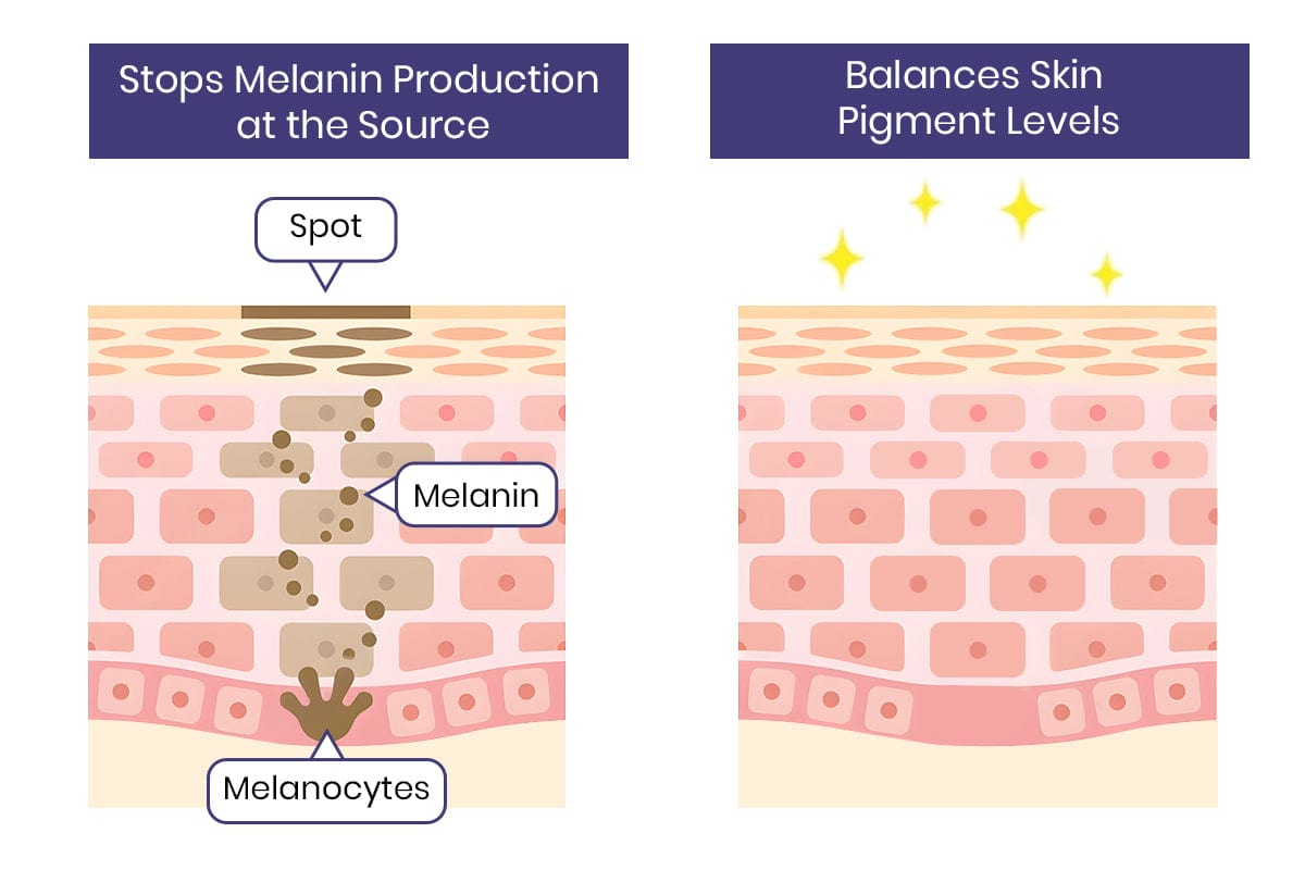 It inhibits melanin production at the source, reduces existing pigmentation, and supports skin renewal for a clearer, more radiant look.