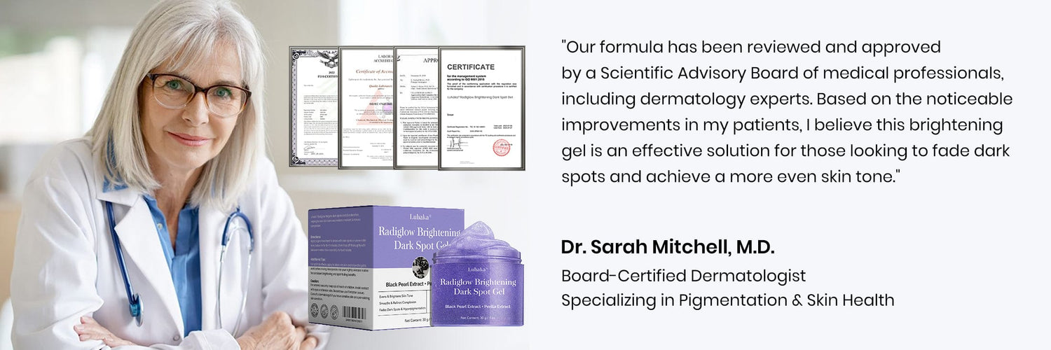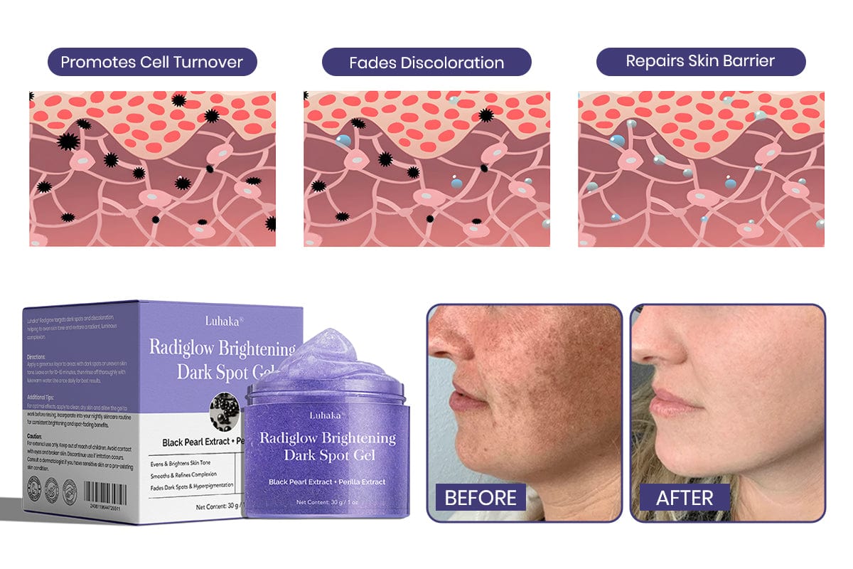 Luhaka® Radiglow Brightening Dark Spot Gel is formulated by top U.S. skincare experts, combining Black Pearl Extract with powerful botanicals to target dark spots and uneven pigmentation. This advanced formula helps regulate melanin production, accelerate skin renewal, and restore a brighter, more even complexion.