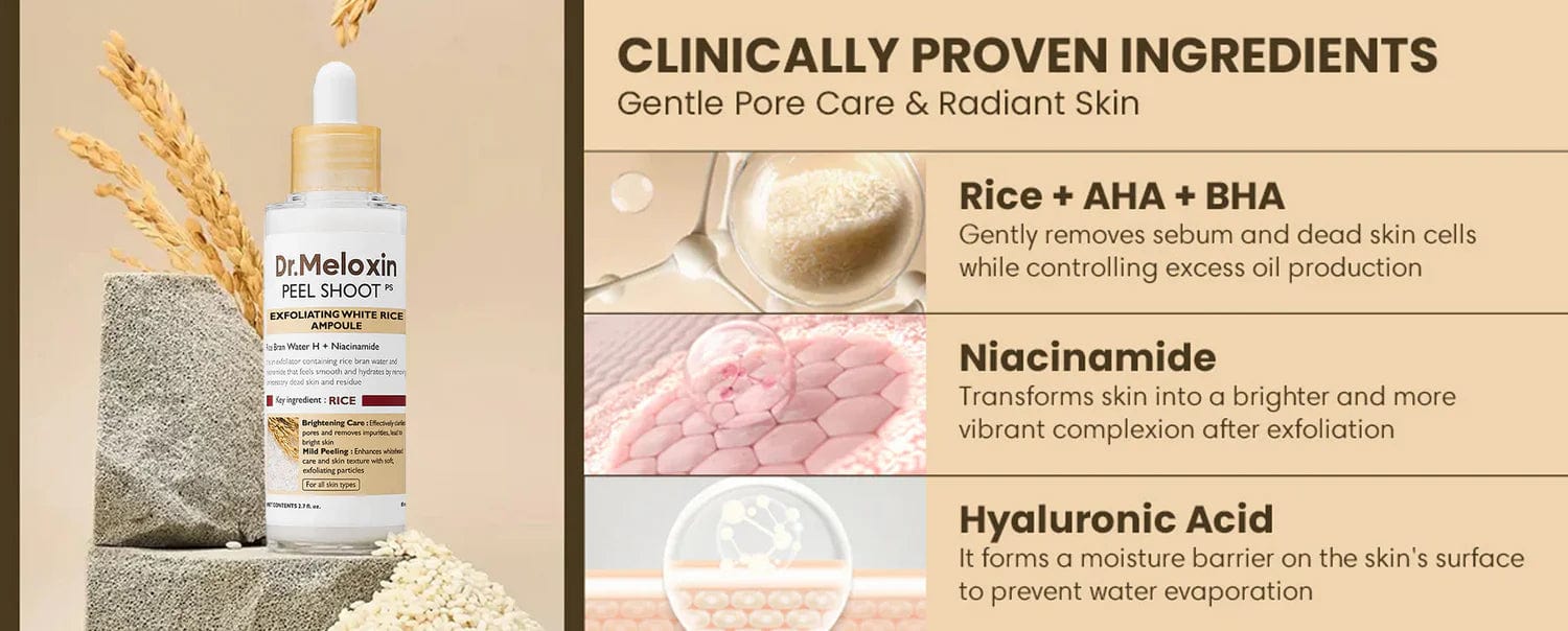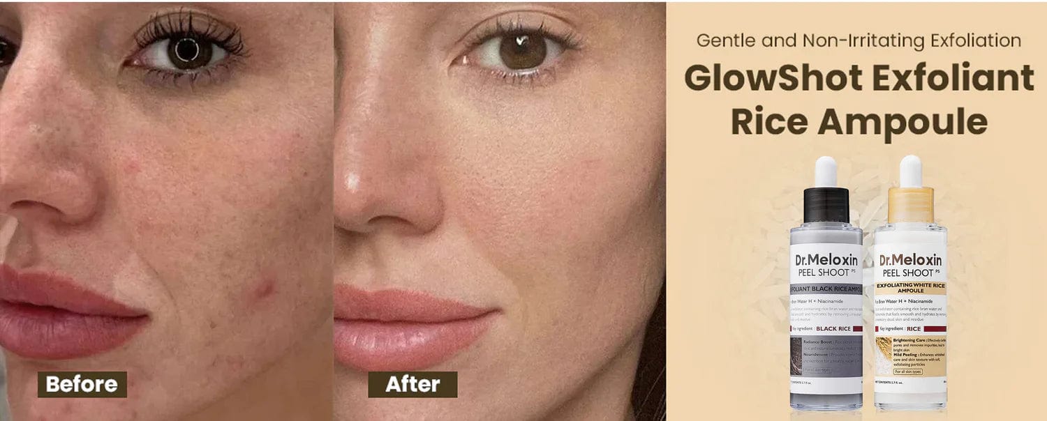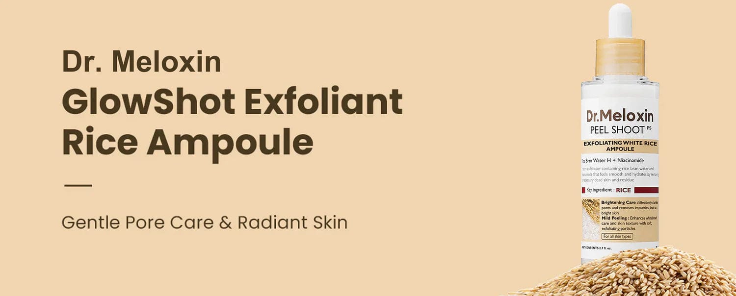Discover the innovative care of Dr. Meloxin GlowShot Exfoliant Rice Ampoule. Unlike traditional peeling products, this advanced formula offers both exfoliation and absorption, gently removing dead skin cells while delivering nourishing ingredients. With every use, your skin will feel smoother, brighter, and more radiant, revealing a healthier-looking complexion.