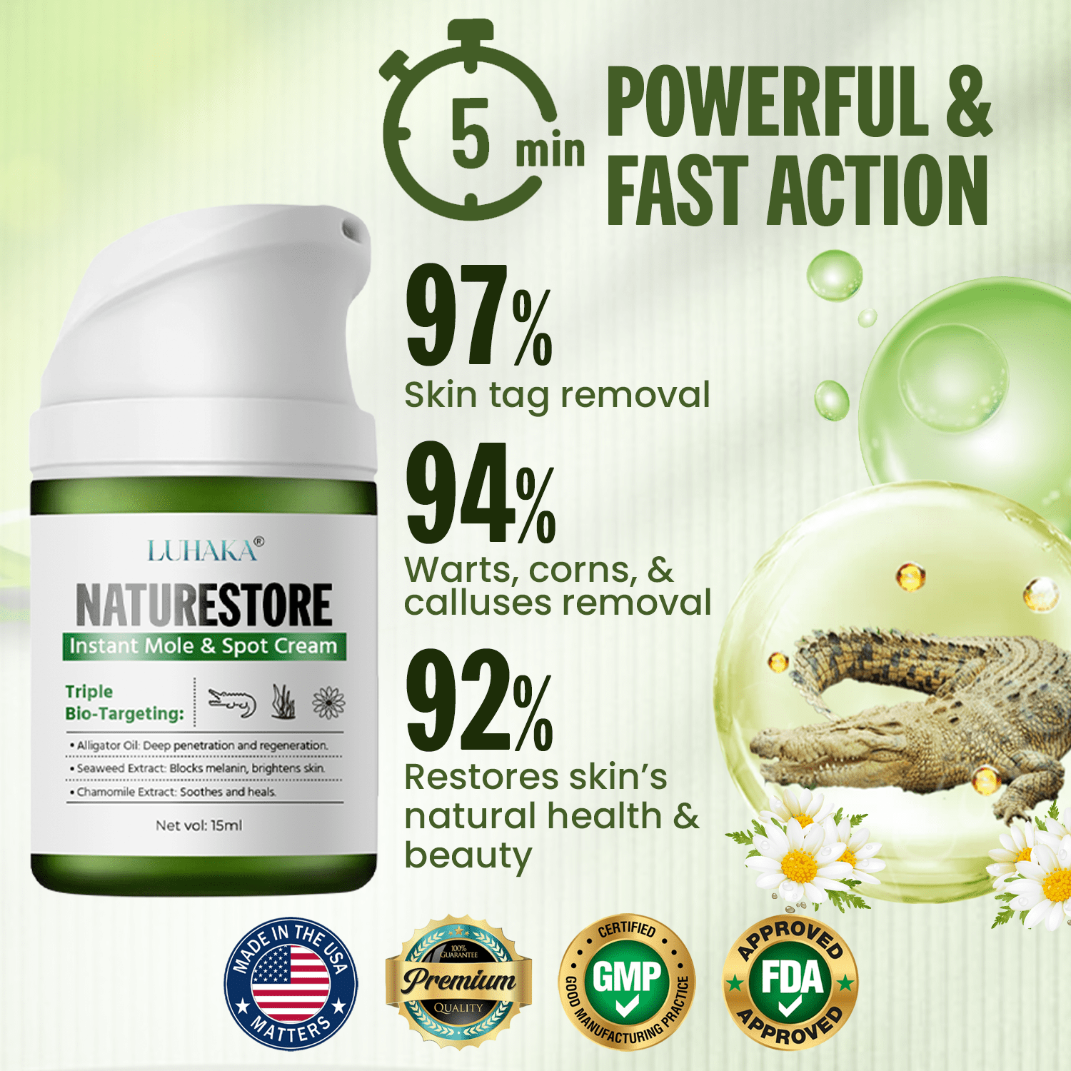 Luhaka® NATURESTORE Instant Mole & Spot Cream offers a fast and effective solution for eliminating skin imperfections such as moles, skin tags, dark spots, and blemishes. Its powerful formula, enriched with three natural ingredients—Alligator Oil, Chamomile Extract, and Seaweed Extract—works gently to erase imperfections without pain, revealing smooth, radiant, and flawless skin.
