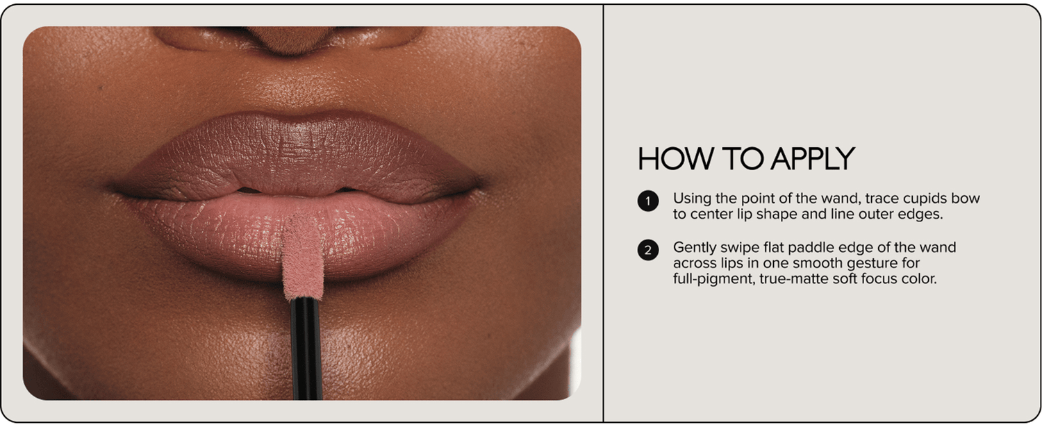 - Gently swipe flat paddle edge of the wand across lips in one smooth gesture for full-pigment, true-matte soft focus color.